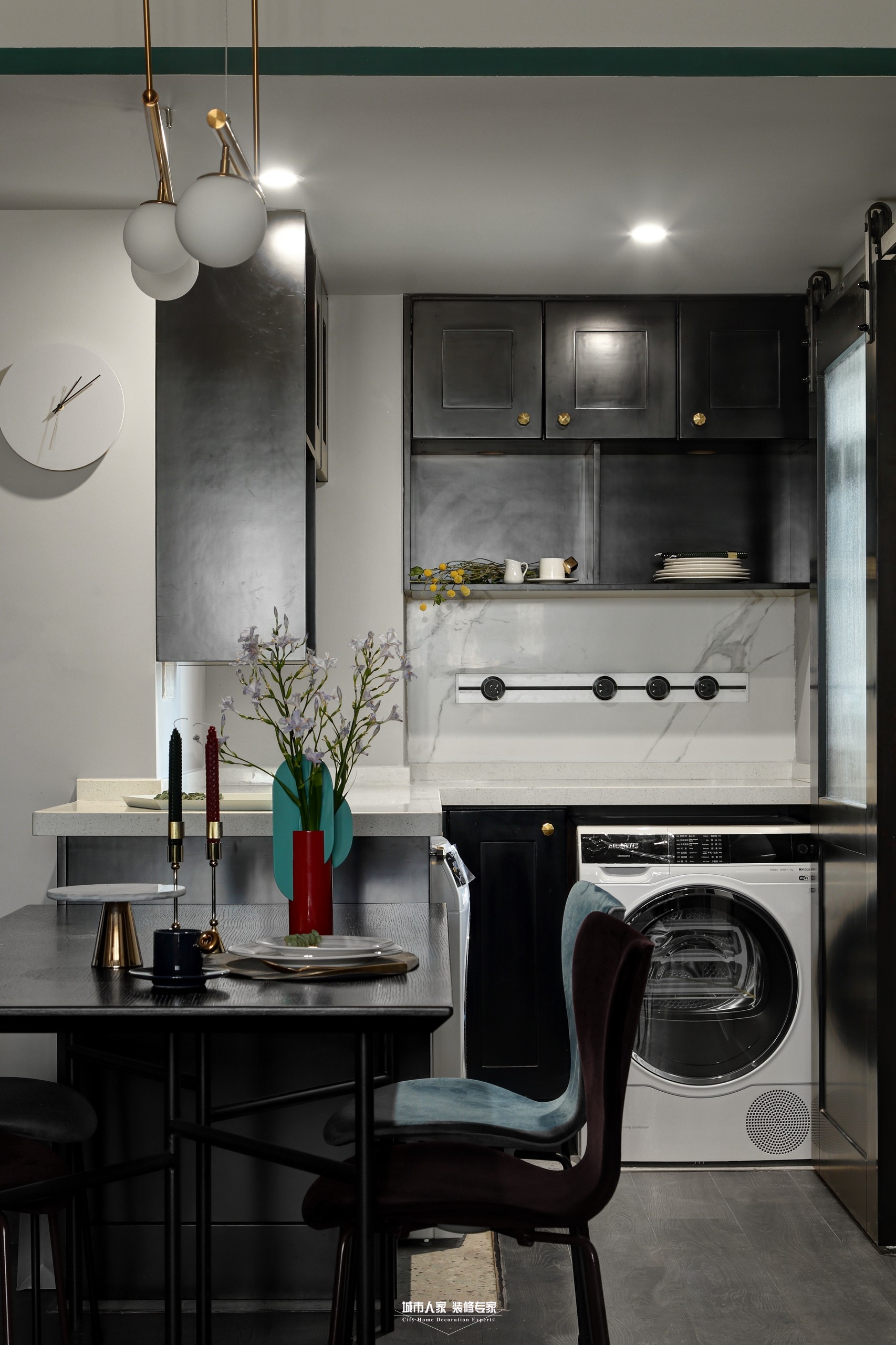 這是一套小戶型,雖然面積不大,但是我們還是為這個小家考慮足夠的收納空間。我們的委托人樹樹和cici是一對年輕人,平時喜歡小酌幾杯,所以我們設(shè)計了開放式的裝飾酒柜,就像cici說的:就算不喝,看著他們也開心!
